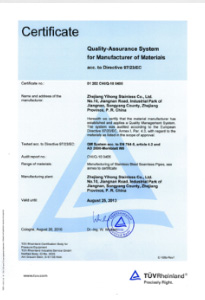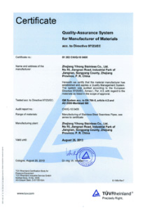 公司嚴(yán)格按ISO9001:2015《質(zhì)量管理體系—要求》、ISO14001:2015《環(huán)境管理體系 要求及使用指南》、ISO 45001:2018《職業(yè)健康管理體系 要求及使用指南》和TSG 07—2019《特種設(shè)備生產(chǎn)和充裝單位許可規(guī)則》,建立完善的管理體系。公司擁有國內(nèi)較大的12000KN冷拔機(jī)組和先進(jìn)的全溫控不銹鋼固溶退火爐等生產(chǎn)設(shè)備,同時(shí)具有ET16-159渦流探傷儀、UT16-159超聲波探傷儀、UT159-830超聲波探傷儀、H159-630水壓試驗(yàn)機(jī)、WAD—600液壓材料試驗(yàn)機(jī)、4XB電腦金相顯微鏡、JQ—300沖擊試驗(yàn)機(jī)、HBRVU—187.5硬度計(jì)、島津光譜儀、化學(xué)分析儀、晶間腐蝕試驗(yàn)等完善的檢測設(shè)備。